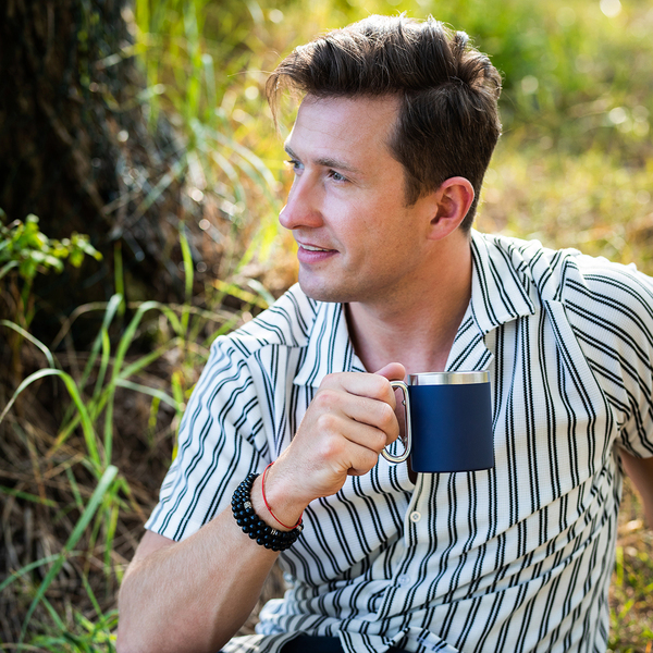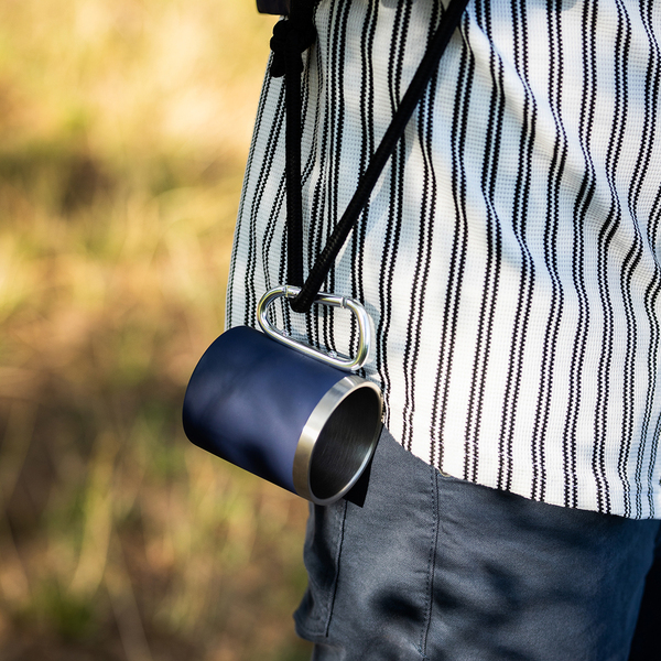 Double wall stainless steel mug with a pleasant to touch surface. The mug has a carabiner-shaped handle. Capacity: 300 ml.