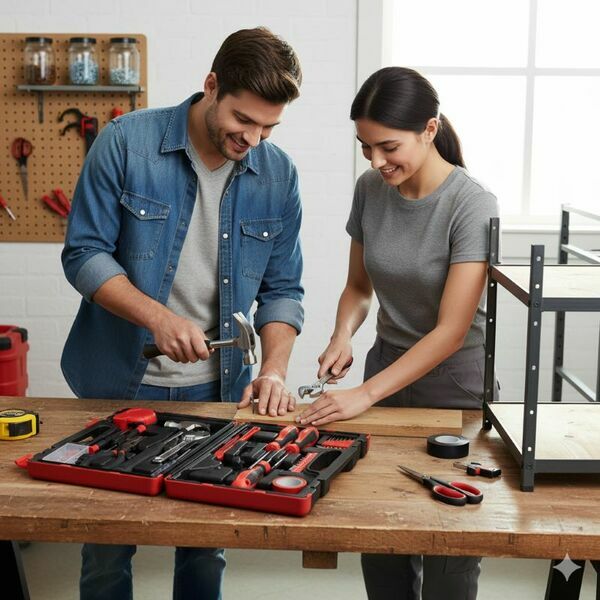 Practical tool set in a handy case. Set contents: utility knife, 8 pcs. Allen keys, 10 screwdriver bits, 2 pcs. screwdrivers, bit holder, insulating tape for wire harnesses, technical tools, safety tester, adjustable wrench 6", hammer, long nose pliers 6", 3M adhesive tape, 2 pcs. working screwdrivers, 80 pcs. fasteners (e.g. nails, screws, related, wheels, etc.), tool case.